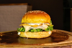 PÃO BOLA, HAMBÚRGUER, PRESUNTO, MUSSARELA, OVO, ALFACE, TOMATE, BARBECUE E CATUPIRY.