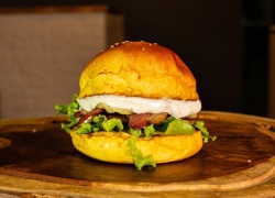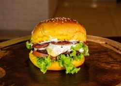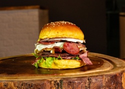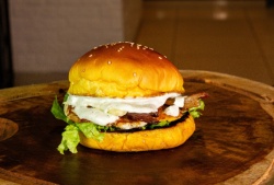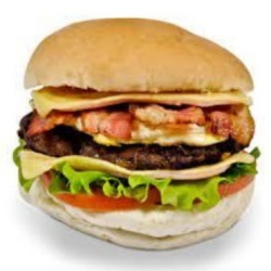 PÃO BOLA, HAMBÚRGUER, PRESUNTO, MUSSARELA, BACON, ALFACE, TOMATE, BARBECUE E CATUPIRY.