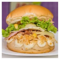 PÃO BOLA, FRANGO, HAMBURGUER, PRESUNTO, MUSSARELA, ALFACE, TOMATE, BARBECUE E CATUPIRY.