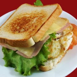PÃO FORMA, PRESUNTO, MUSSARELA, OVO E VERDURAS.