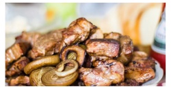 300G. DE CARNE DE PORCO, 300G. DE BATATA, CEBOLA, FAROFA TEMPERADA E VINAGRETE.