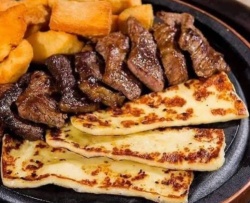 250G. CARNE BOVINA, 300G. BATATA, 2 FATIAS DE QUEIJO COALHO, FAROFA TEMPERADA E VINAGRETE.