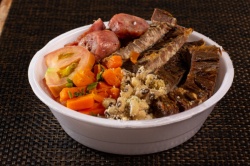 250G. DE CARNE BOVINA, 300G. DE BATATA, CALABRESA FATIADA, CEBOLA, FAROFA TEMPERADA E VINAGRETE.